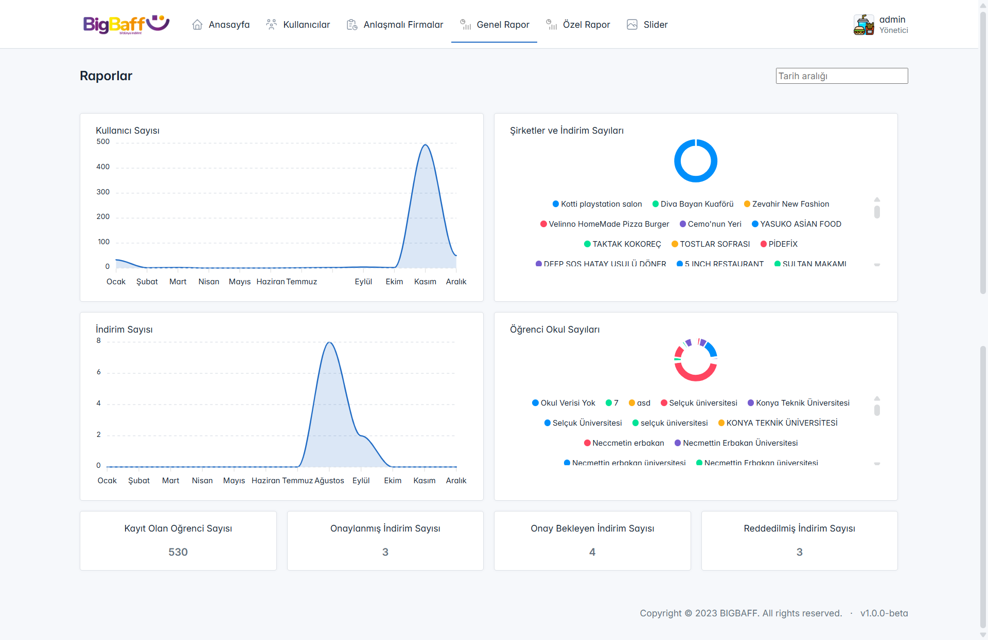 Aylık kullanıcı sayısı, kayıtlı öğrenci sayısı, onaylanan veya reddedilen indirim kampanyaları gibi önemli metrikler grafiksel olarak sunulur; firma bazlı indirim kullanımları ve kampanya etkinlikleri takip edilir; kullanıcı veya firma özel raporlar oluşturularak performans analizleri yapılabilir.